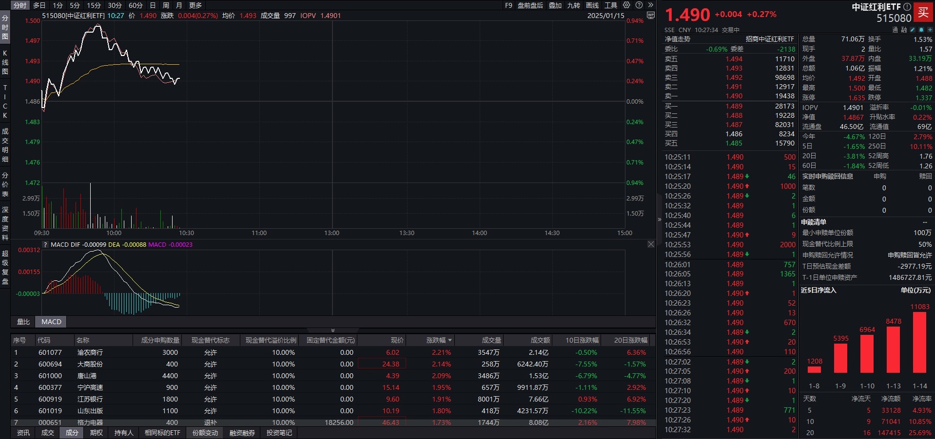 值得关注的是,据Wind金融终端数据,1月14日,中证红利ETF(515080)单日获资金净流入超1.1亿元,已连续7个交易日获净流入;近五个交易日(1月8日—14日)累计 “吸金” 超3亿元。该ETF最新流通规模为69.13亿元,最新流通份额为46.50亿份,均创历史新高。